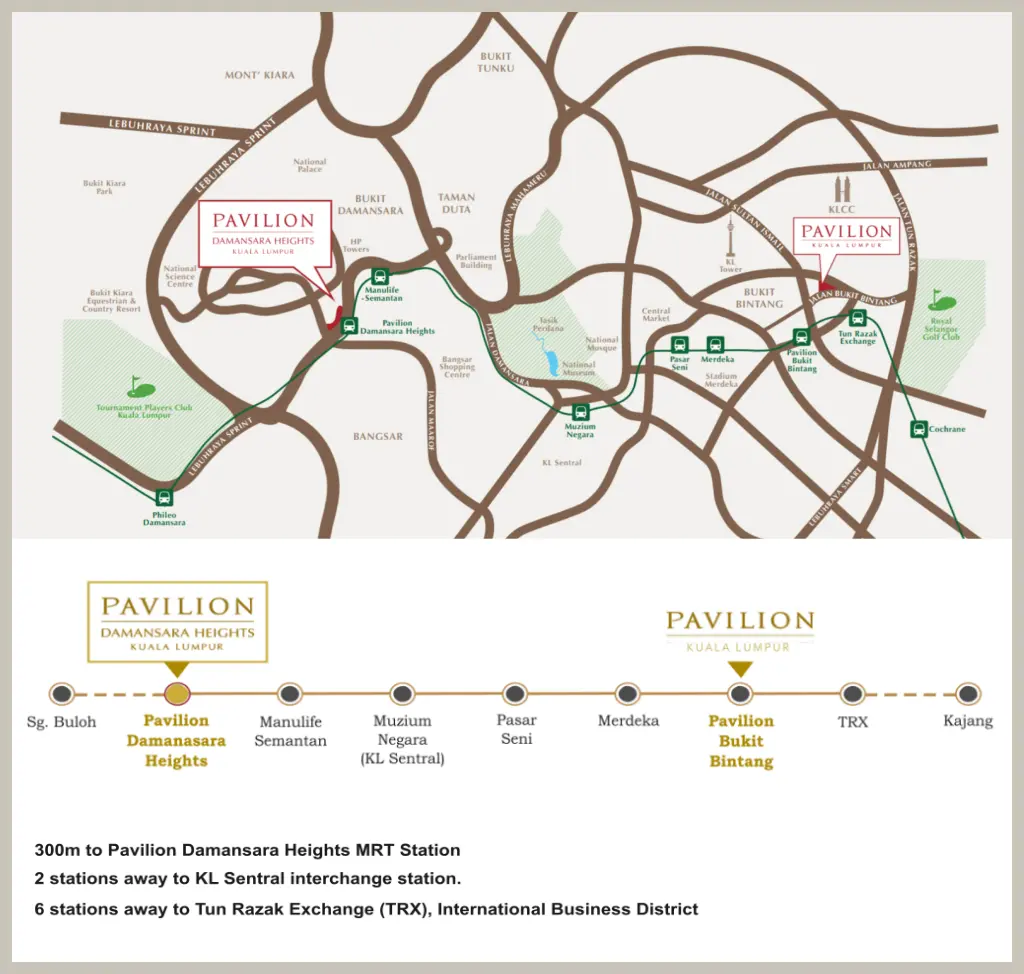 Approximately 300m walking distance to Pavilion Damansara Heights MRT station, 2 stations away from KL Sentral interchange station and gateway to KLIA, on a direct line to Tun Razak Exchange (TRX) covering 31 locations from Sg. Buloh to Kajang, including The Curve, One Utama and Bukit Bintang.